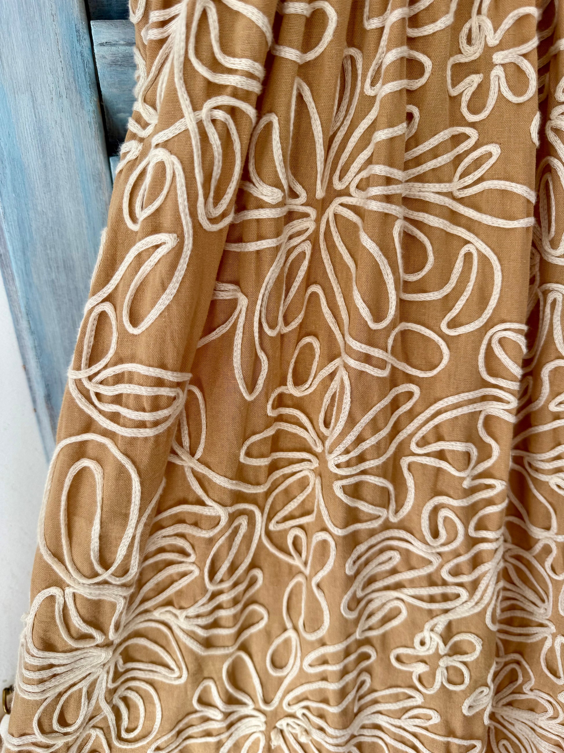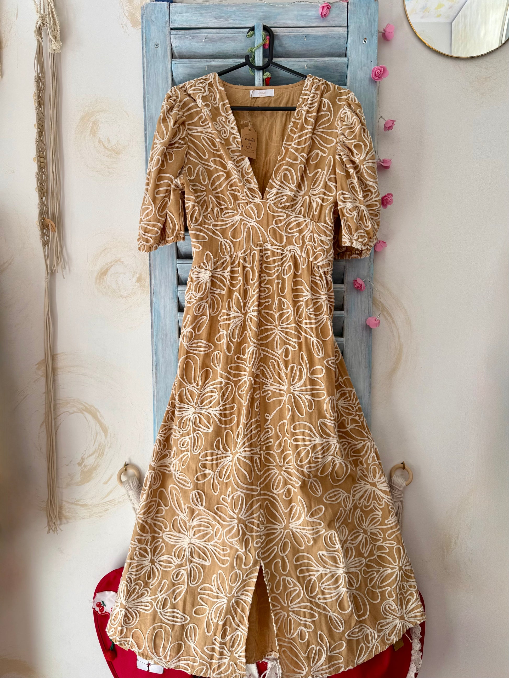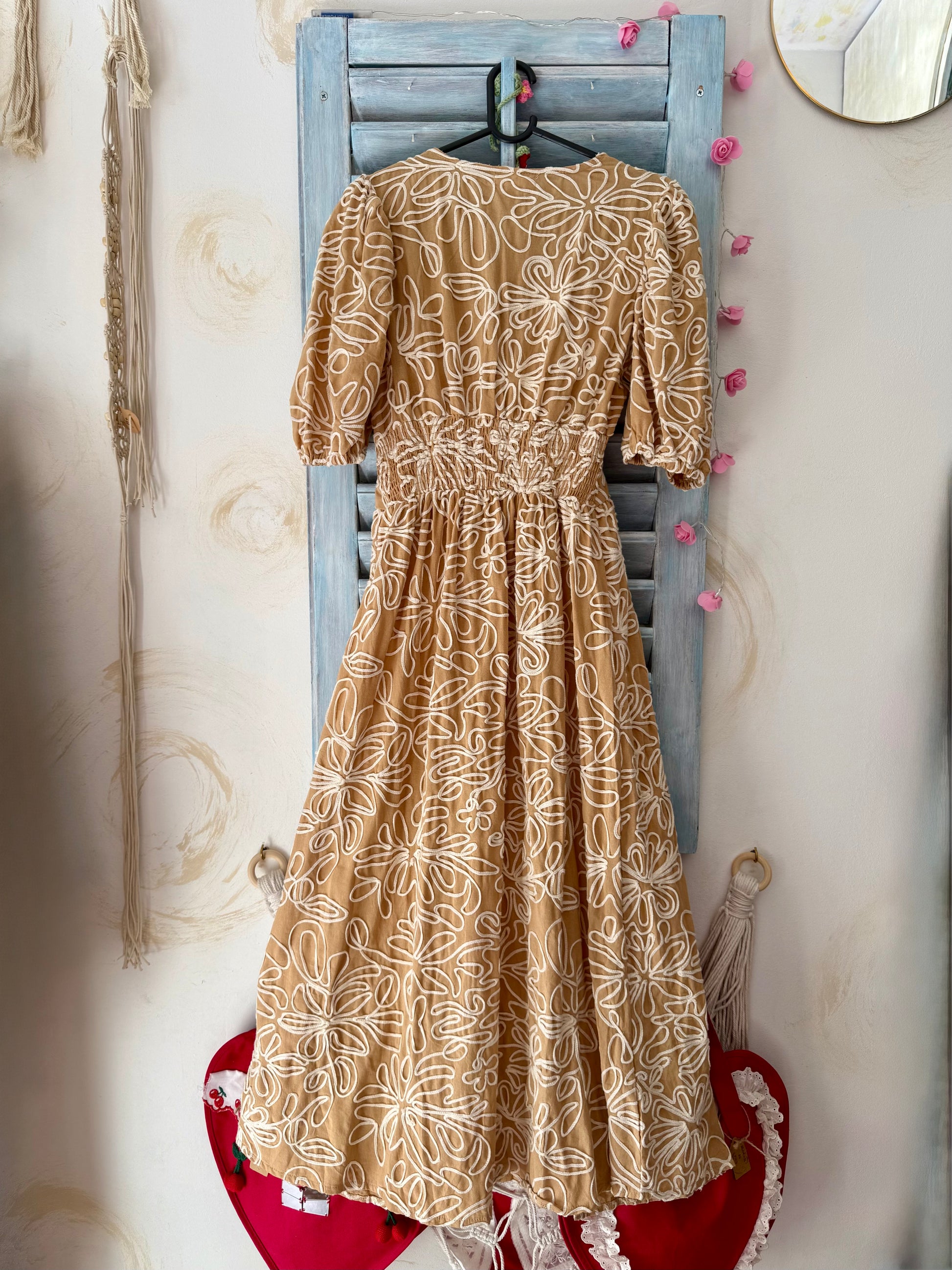 Em je haljina za sva vremena, zbog kroja koji prilagođava tijelu zahvaljujući žabicama na leđima, divnom vezu i blago puf rukavima. Neka vas naoko veliki izrez ne zabrinjava, on je prilika za neku vau ogrlicu.