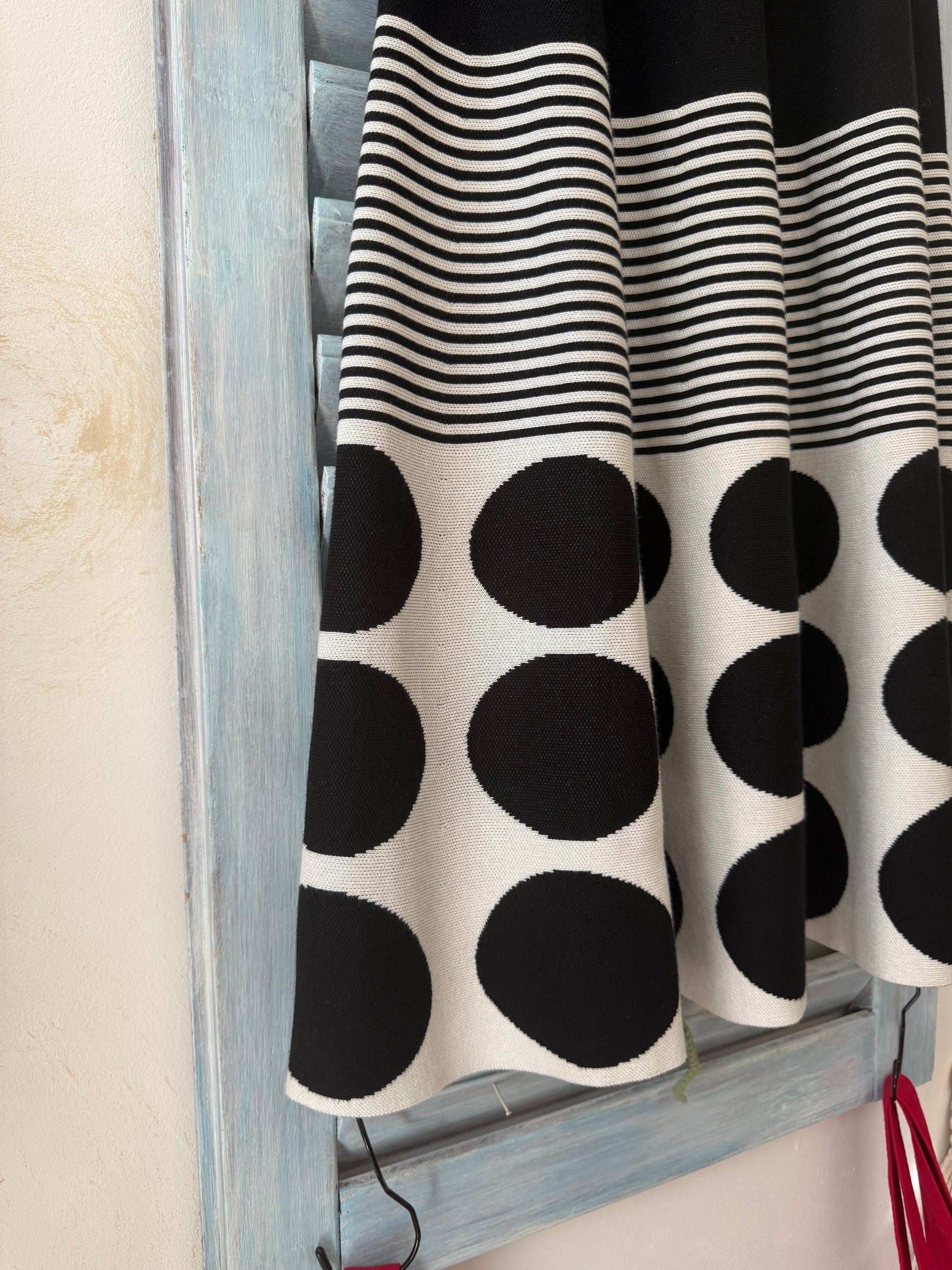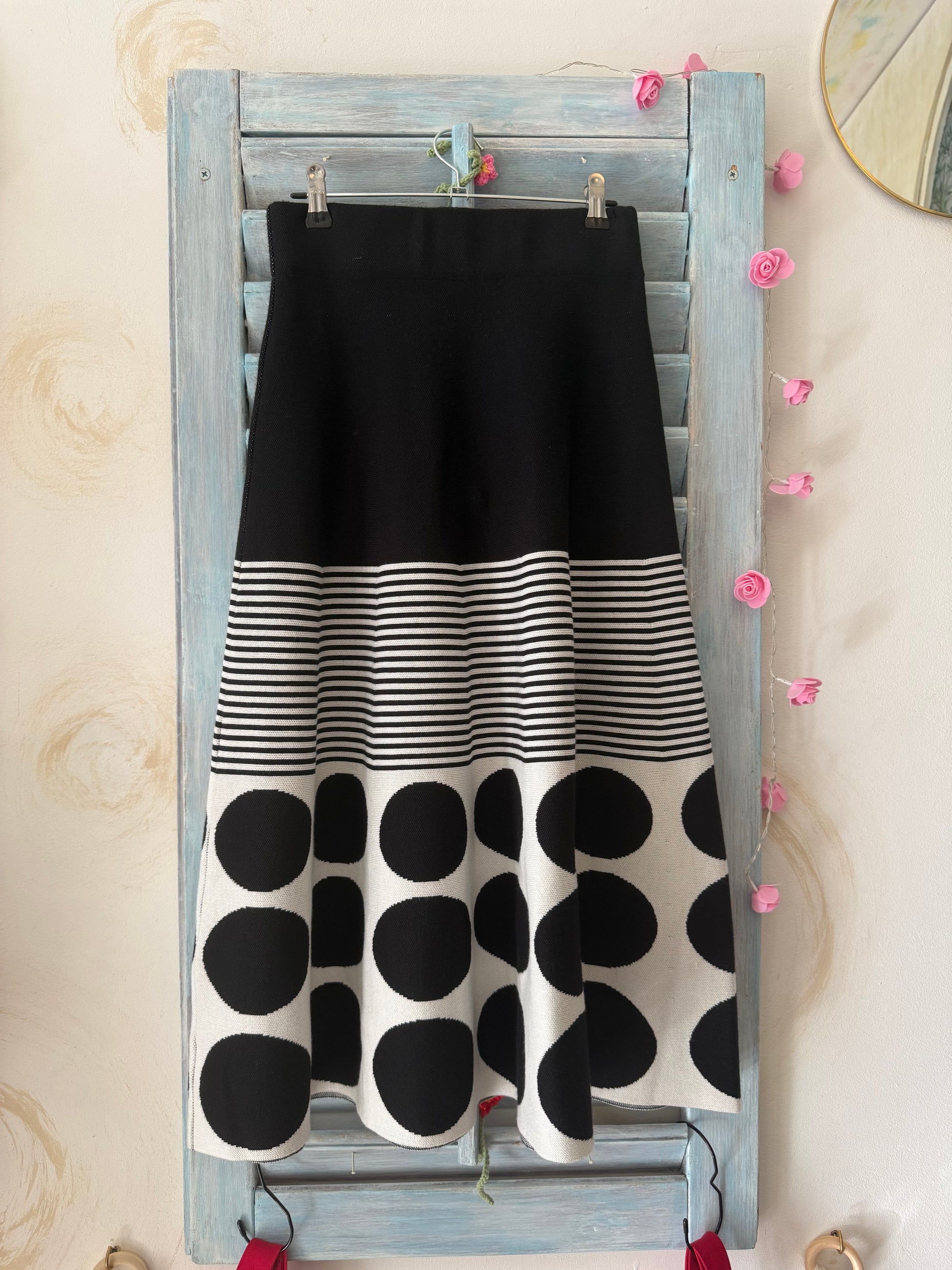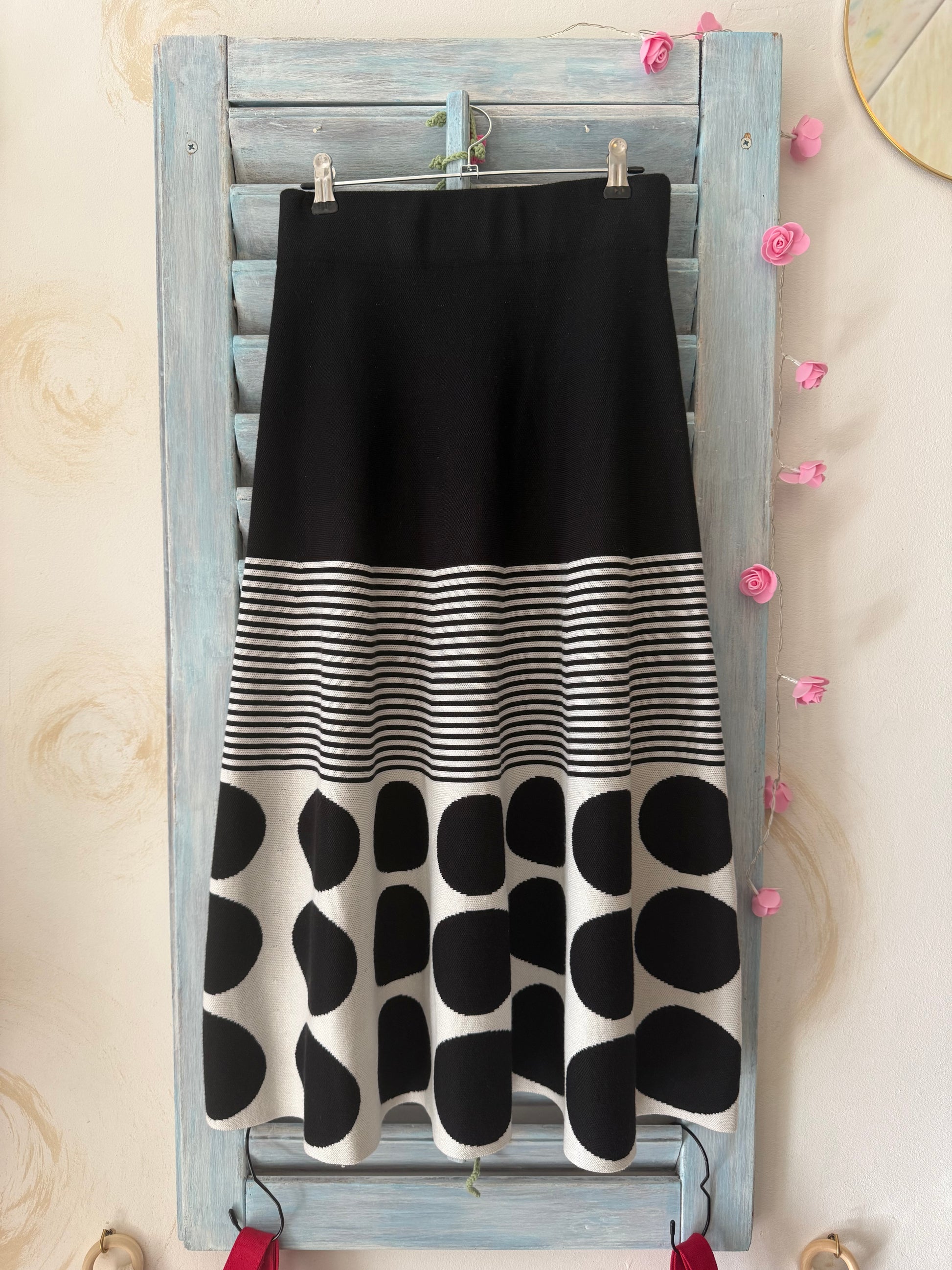 Do-St suknja na sebi ima neponovljiv suživot točki i pruga, crne i bijele. U pasici se nalazi čvršća guma, a suknja je debela i rastezljiva.